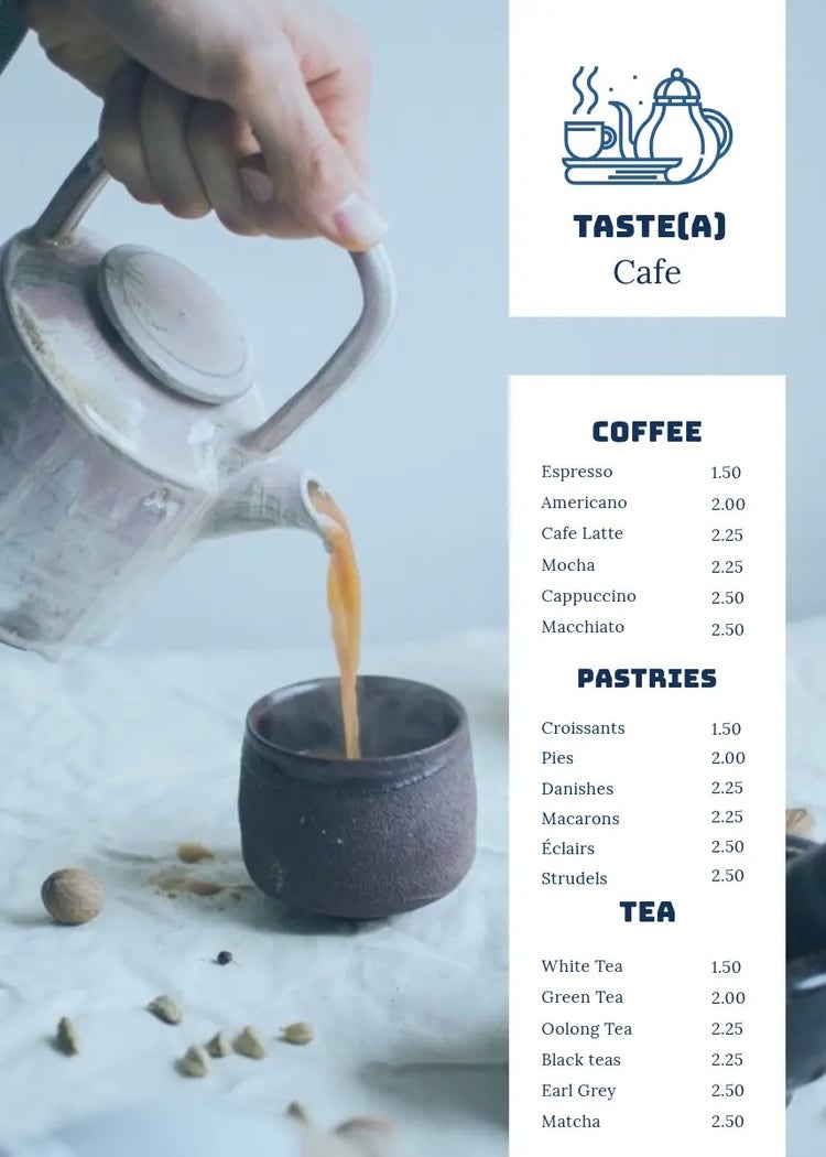 Adobe Express 메뉴판 템플릿을 사용하여 레스토랑의 특색을 반영하는 멋진 메뉴판을 만드세요. 사진, 아이콘, 그래픽, 글꼴을 사용하여 메뉴판 디자인 테마를 정할 수 있습니다. 직접 로고와 색 구성표를 업로드하여 메뉴판에 진정성을 더할 수 있습니다. Adobe Express를 사용하면 메뉴판을 무료로 간편하게 만들고 저장하여 고객과 온라인에 몇 분 만에 공유하세요.