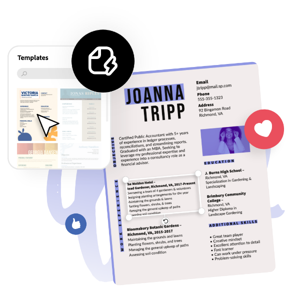 드래그 앤 드롭 에디터로 오래된 이력서를 탭 몇 번으로 업데이트할 수도 있습니다. 완성된 작업물을 클라우드 저장소에 저장하여 필요할 때마다 액세스할 수도 있습니다. 편집이 끝나면 '공유' 옵션을 사용해 이력서를 PDF 파일로 지원 사이트에 제출하세요. 이제 눈에 띄는 온라인 이력서를 만드는 완벽한 방법을 찾을 걱정은 하지 않아도 됩니다. Adobe Express 온라인 이력서 작성기를 사용하면 가장 매력적인 방식으로 본인의 역량을 보여주고 잠재적인 채용 담당자의 관심을 끌 수 있습니다.