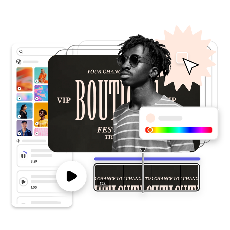 일렉트로 팝부터 펑크, 잔잔한 피아노 솔로, 강렬한 펑크까지, Adobe Express 온라인 에디터는 충성도 높은 팔로워와 곧 팬이 될 사람들을 사로잡을 독특한 뮤직비디오를 제작하는 데 필요한 모든 것을 갖추고 있습니다. 무료 뮤직비디오 편집 도구와 기능을 사용하여 음악과 뛰어난 시각 효과를 손쉽게 결합할 수 있습니다. 직접 영상을 조합하고 사운드트랙을 업로드한 다음 드래그 앤 드롭 온라인 에디터를 사용하여 아이콘, 가사 등으로 뮤직비디오의 시간을 완벽하게 맞추고 맞춤화할 수 있습니다. 편집 노하우가 필요하지 않습니다.