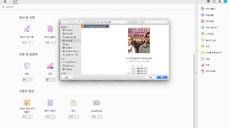 열기 대화 상자에서, 다운로드한 Local Magazine Spring.pdf 샘플 파일 또는 압축할 다른 PDF 문서를 선택하고 열기 를 클릭합니다.