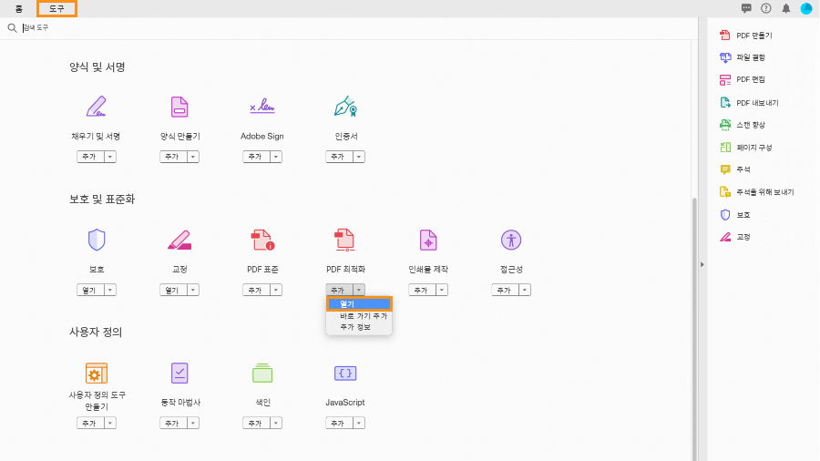 PDF 파일 크기를 축소하려면 PDF 최적화 도구를 엽니다. 도구 센터에서 이 도구에 액세스할 수 있습니다. 왼쪽 상단의 도구 탭을 클릭하고 PDF 최적화 도구가 나올 때까지 아래로 스크롤한 다음, 드롭다운 메뉴에서 열기 를 선택합니다.