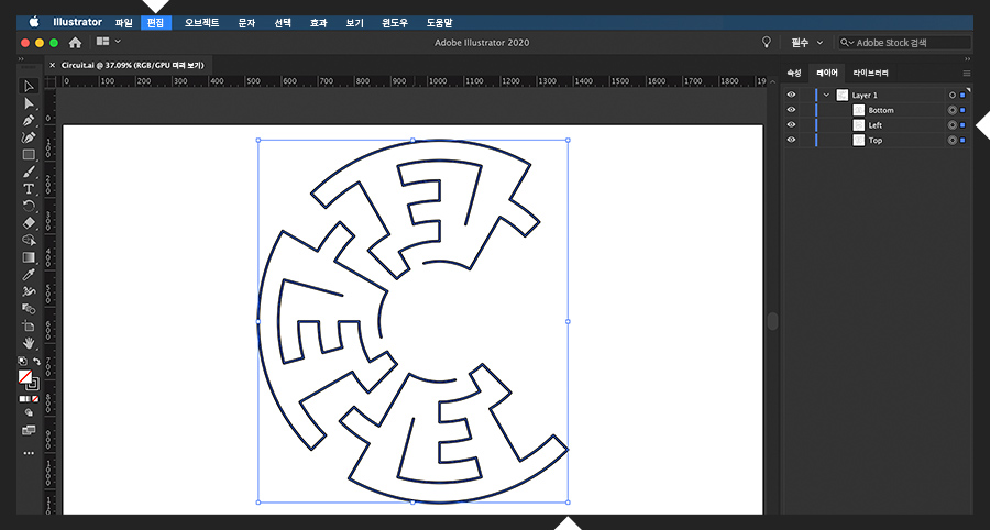 먼저 Adobe Illustrator에서 각 레이어에 전체 회로판 패턴의 각 부분이 포함되어 있는지 확인합니다. 적절한 설명이 되도록 레이어에 레이블을 지정합니다(예: Top, Left, Right, Bottom). 이렇게 하면 나중에 After Effects에서 알아보는 데 도움이 됩니다. 디자인 전체를 드래그하여 선택하고 클립보드에 복사합니다(편집 > 복사).