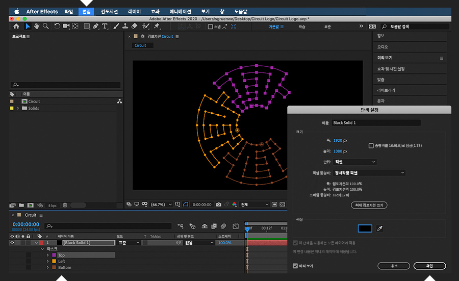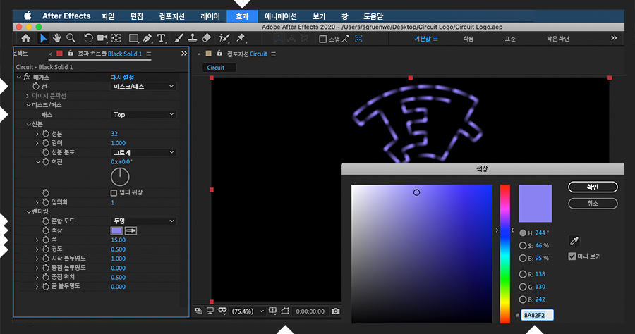 Adobe After Effects에서 생동감 있게 윤곽선을 그리는 베가스 효과를 사용하여 인쇄된 회로 패턴이 자동으로 그려지도록 만들어 보세요.