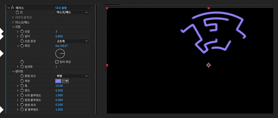 단색 레이어가 선택된 상태에서 효과 > 생성 > 베가스를 선택합니다. 효과 컨트롤 패널에서 선을 마스크/패스로 설정하고 패스를 특정 마스크(예: Top)로 지정합니다. 마스크 가시성을 꺼서 마스크 패스가 아닌 적용된 효과를 확인합니다. 렌더링 섹션에서 점선 윤곽이 더 뚜렷하게 나타나고 가장자리가 돋보이도록 폭과 경도를 높입니다. 마지막으로 혼합 모드를 투명으로 선택하고 색상을 선택합니다.