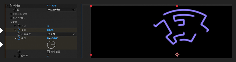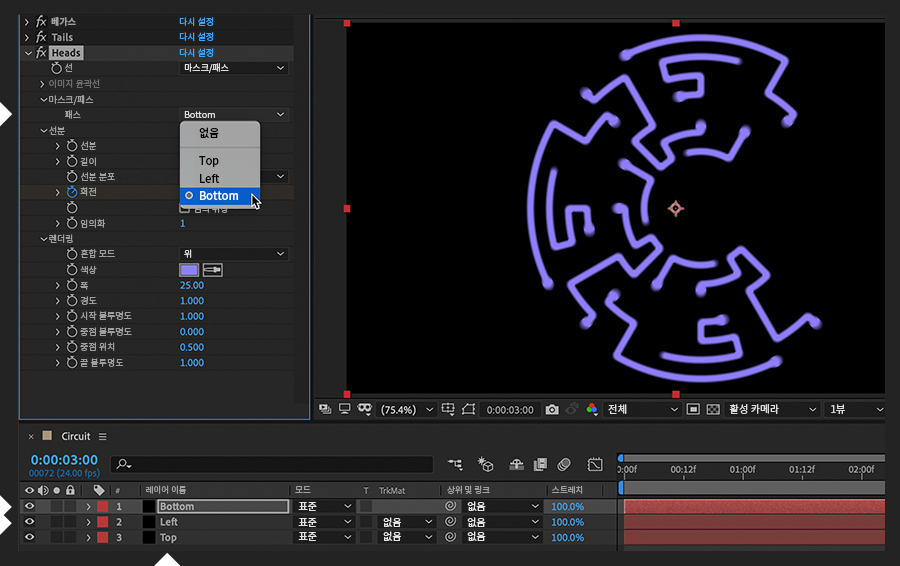원하는 대로 회로판 디자인이 나타나도록 베가스를 설정한 다음에는 효과가 표시되도록 애니메이션을 적용합니다. 재생 헤드를 앞으로 이동하고 길이 키프레임을 켭니다. 재생 헤드를 시작 부분으로 이동하여 0이 되게 합니다. 컴포지션을 미리 보면서 각 선분이 고정점에서 고유한 패스를 그려 디자인을 완성하는지 확인합니다. 0에서 시작하여 선택된 최종 값까지 회전 키프레임을 생성합니다. 이제 미리 보기를 해보면, 최종 회전 키프레임 값을 기반으로 천천히 또는 빠르게 패스를 따라 각 선분의 시작 지점이 종료 지점을 따라갑니다.