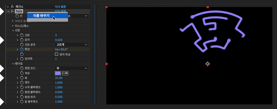 디자인을 완성하기 위해 인쇄된 회로선 끝에 둥근 테스트 점을 추가합니다. 이 점들은 매우 짧고 두꺼운 선 모양입니다. 효과 컨트롤 패널에서 베가스 효과를 축소하고 복제합니다(Command/Ctrl+D). 베가스 2를 마우스 오른쪽 버튼으로 클릭하고 Tails 로 이름을 바꿉니다. Tails 인스턴스에서 길이 키프레임을 삭제하고(스톱워치 클릭) 길이를 0에 가깝게 줄입니다. 마지막으로 혼합 모드를 '위'로 변경하고, 폭을 높여 점을 만든 다음, 끝 불투명도를 최대값으로 설정합니다.