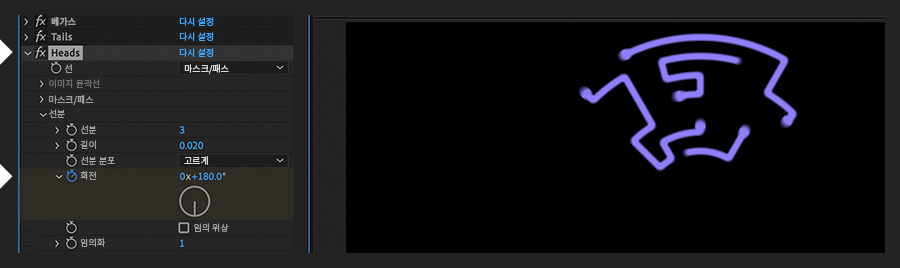 Tails 인스턴스를 축소하고 복제한 다음 Heads 로 이름을 바꿉니다. Heads 인스턴스에서 재생 헤드를 최종 회전 키프레임에 놓고 각 선분의 점이 꼬리에서 머리로 패스를 따라 이동하도록 값을 스크러빙합니다. 컴포지션을 미리 보면 움직이는 선의 두 끝에 점이 표시됩니다.