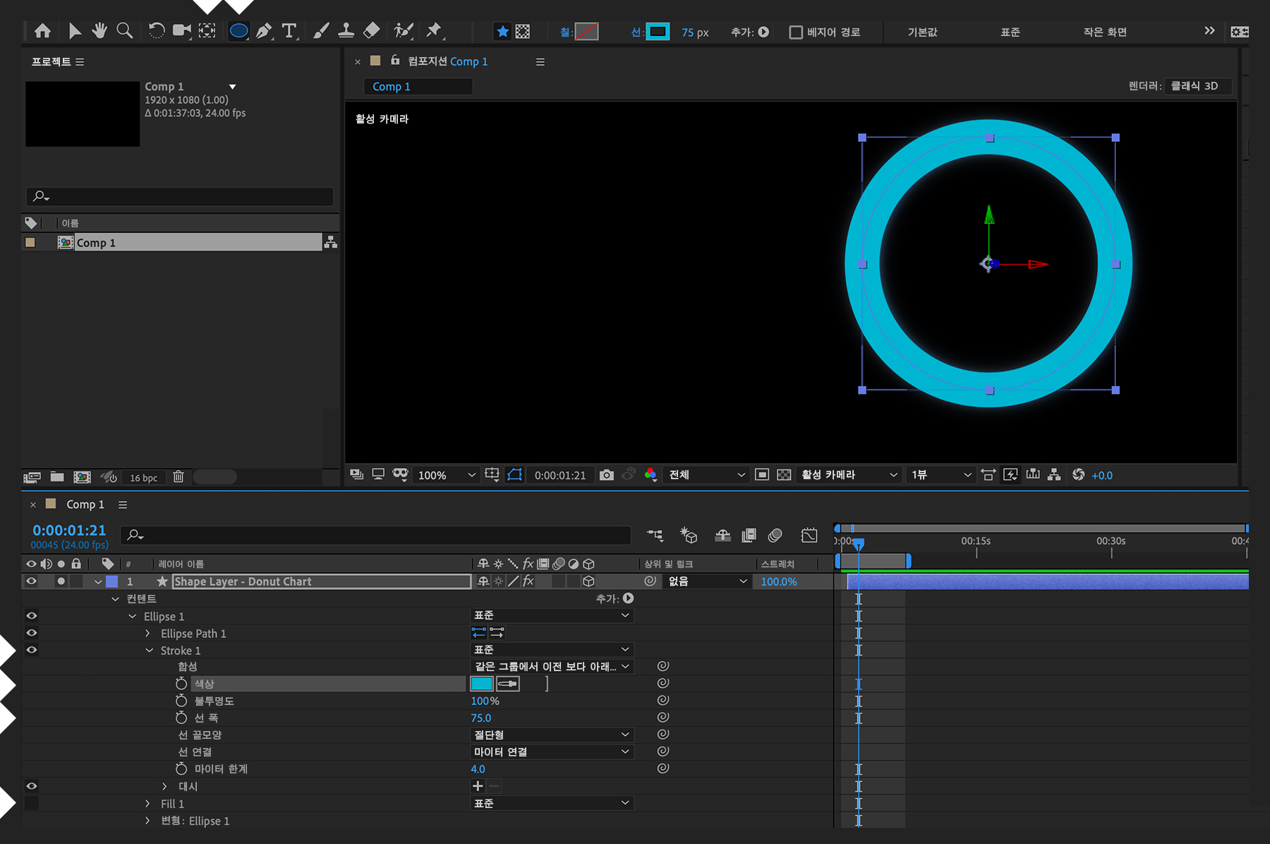 모양 레이어를 만들어 빈 컴포지션에 추가합니다. 도넛 그래프를 만들려면 먼저 원을 그려야 하므로 타원 툴을 사용하여 Shift 키를 누른 상태에서 드래그합니다. Command/Ctrl을 누른 상태에서 뒤로 팬 툴(Y 누름)을 클릭하면 모양의 기준점이 가운데에 자동으로 배치됩니다. 레이어의 콘텐트 폴더를 열고 선 1 레이어(눈동자 클릭)를 켠 다음 잘 보이도록 선 폭 값을 높입니다. 선 색상을 선택한 다음 칠 1 레이어를 끄거나 삭제합니다.