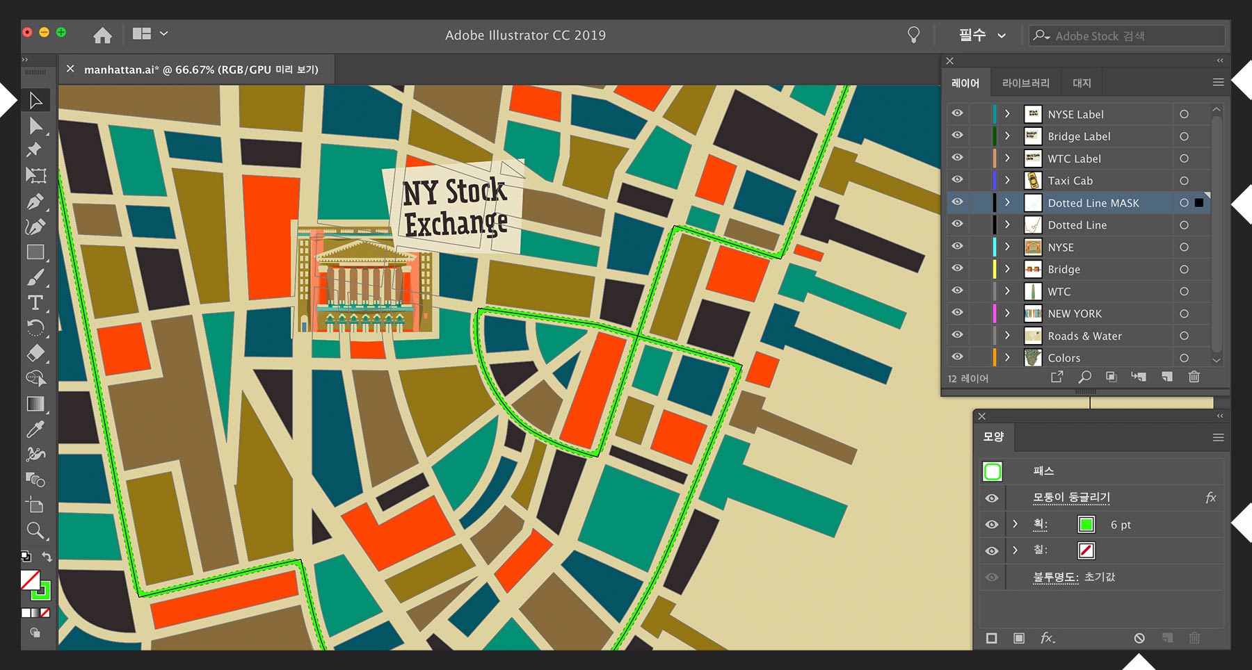 지도 애니메이션을 통해 A 지점에서 B 지점으로 이동하는 방법을 쉽게 안내할 수 있습니다. 이 실습에서는 Illustrator에서 만든 지도를 사용하여 After Effects에서 택시 경로를 추적했습니다. 로어 맨해튼의 샘플 지도 또는 보유한 디자인을 사용합니다. 원하는 결과를 얻으려면 Illustrator 문서 크기가 After Effects 컴포지션의 두 배 크기여야 합니다.