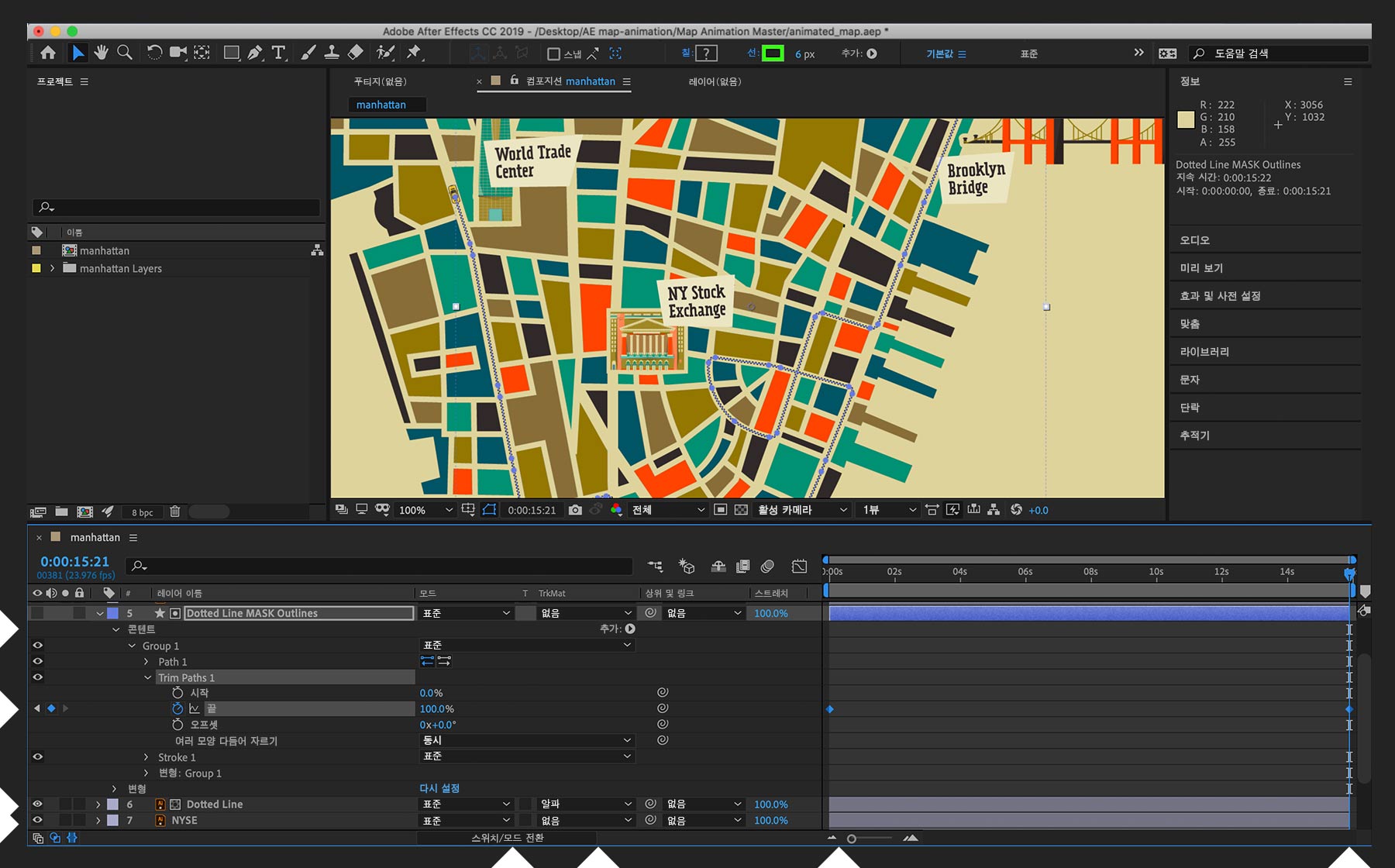 Adobe After Effects에서 경로 애니메이션 기법과 아이콘 표시를 적용하여 Adobe Illustrator에서 만든 정적인 지도를 생동감 있게 움직이는 지도로 바꿀 수 있습니다.