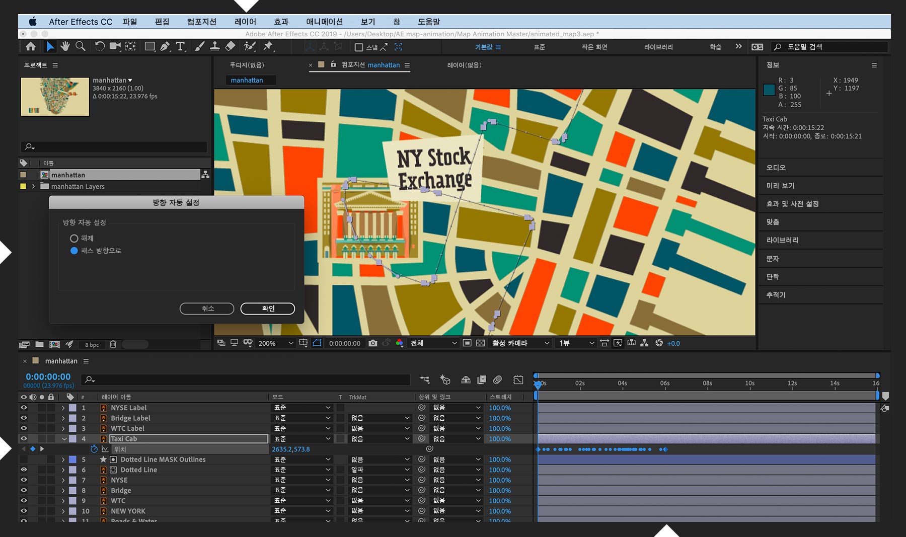 지도에서 움직일 개체의 유형과 상관없이(이 실습에서는 택시임) 해당 개체를 포함하는 레이어를 선택하고 레이어 > 변형 > 방향 자동 설정을 선택합니다. 방향 자동 설정 대화 상자에서 패스 방향으로를 선택하고 확인을 클릭합니다. Illustrator로 전환하여 아트웍에서 패턴이 있는 선 레이어를 선택하고 편집 > 복사를 선택합니다. After Effects로 돌아가 재생 헤드를 컴포지션의 시작 부분에 놓습니다. Taxi Cab 레이어를 선택하고 P 키를 눌러 위치를 엽니다. 이제 위치 매개 변수 자체를 선택하고 편집 > 붙여넣기를 선택하여 패스 점을 키프레임으로 붙여넣습니다. Option/Alt 버튼을 누른 상태에서 모든 키프레임이 선택된 채로(파란색) 마지막 키프레임을 컴포지션 끝까지 드래그합니다. 이렇게 하면 상대적 위치가 유지되고 택시가 패턴이 있는 선과 동일한 속도로 이동합니다. 마지막으로 컴포지션 패널에서 붙여넣은 패스의 윤곽선에 있는 점 중 하나를 선택하고 지도에서 적절한 위치에 다시 배치합니다. 정확하게 하려면 확대/축소 레벨을 높입니다. 컴포지션을 재생하면서 택시가 정의된 패스를 따라 이동하고 패턴이 있는 선이 택시 뒤에 있는지 확인합니다. 필요한 경우 Taxi Cab 레이어에서 R 키를 누르고 회전 값을 변경하여 택시가 앞을 향하도록 설정합니다.
