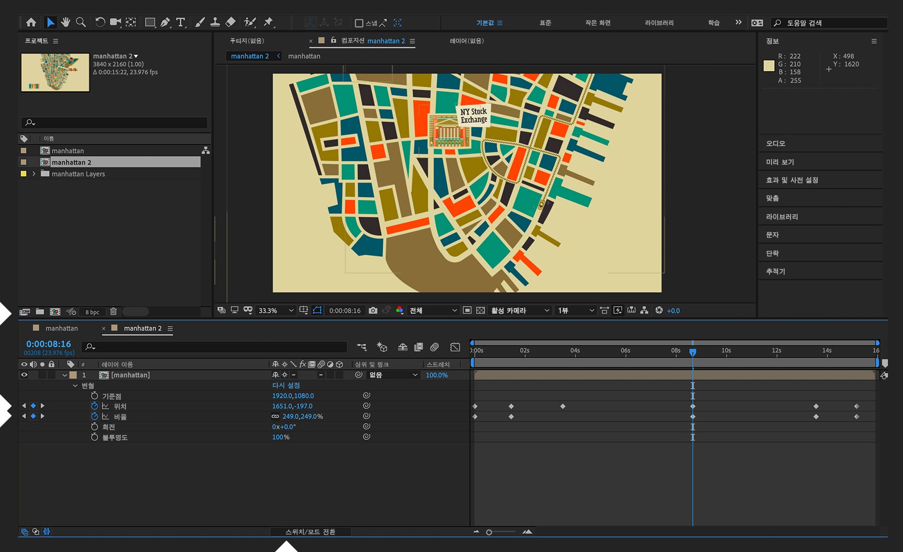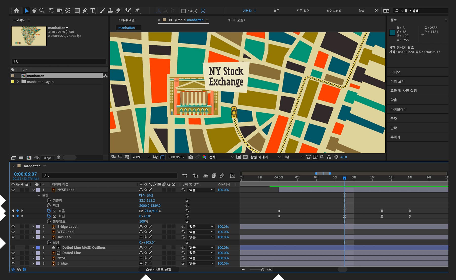 지도를 확대하고 도심 속의 택시(또는 원하는 개체)를 따라 가는 동영상을 만듭니다. 프로젝트 패널에서 지도 컴포지션을 새 컴포지션 버튼으로 드래그하여 새 컴포지션을 만듭니다. 연속 래스터화를 클릭하여 이 모드를 켭니다. 위치와 비율 값에 키프레임을 설정하여 카메라가 지도 애니메이션을 확대하고 움직이는 차량 또는 지도 경로를 따라 가는 장면을 시뮬레이션합니다. 해당 키프레임을 선택하고 F9를 눌러 천천히 들어오기 및 나가기를 적용하여 애니메이션을 부드럽게 만듭니다.