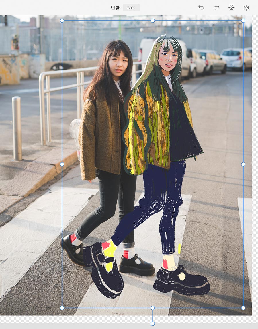 인물 사진에 멋스러움을 더하기 위해 드로잉의 일부분을 과장되게 표현합니다. 올가미 툴을 선택하고 발 주위로 선택 영역을 그린 다음 하단 메뉴에서 변환을 누르고 모퉁이 핸들을 사용하여 선택 영역의 크기를 조정합니다. 완료되면 완료 및 선택 취소를 누릅니다. 이 기법을 사용하여 머리를 작게 만듭니다.