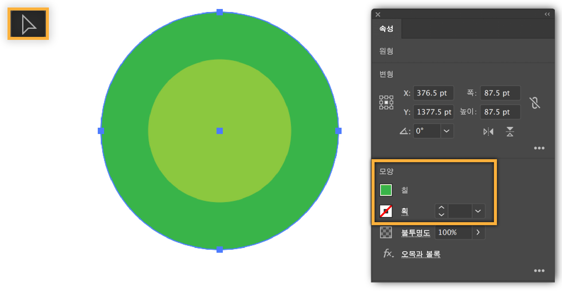 원을 그립니다. 마젠타색 십자선이 표시될 때까지 모양을 드래그하면 정확하게 둥근 원을 만들 수 있습니다.