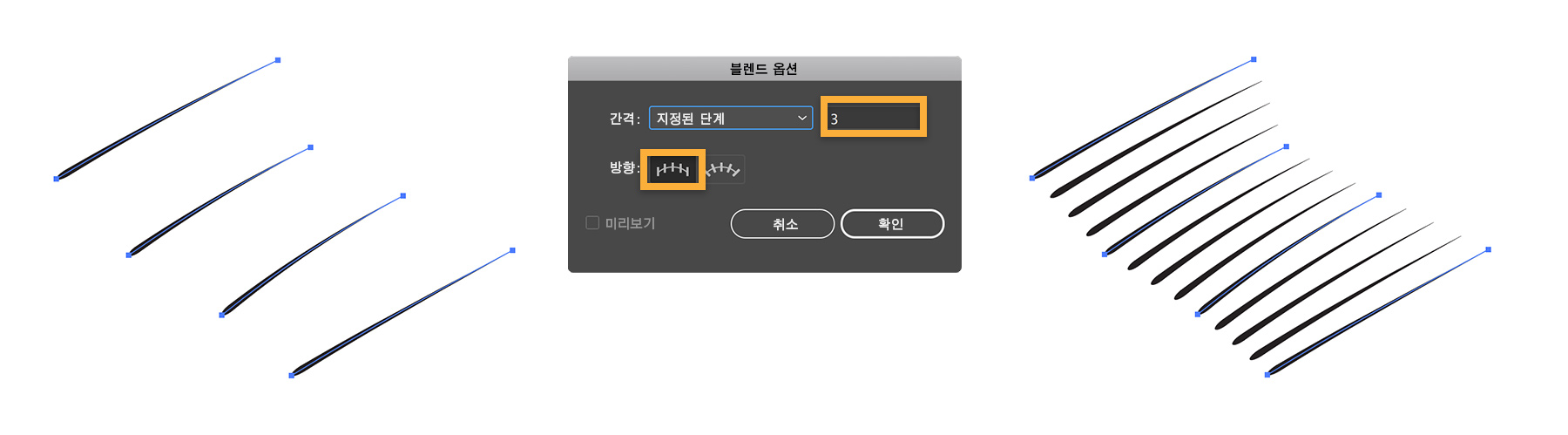 Tracie 작품의 핵심은 크로스 해칭으로 만들어진다는 데 있습니다. 그녀는 이 크로스 해칭 기법을 사용하여 정교한 음영 효과를 만들어내고 있습니다. 이 크로스 해칭을 만들기 위해 사용자 정의 브러쉬로 획을 몇 번 그린 다음 블렌드 툴(오브젝트 > 블렌드 > 블렌드 옵션, 다음으로 오브젝트 > 블렌드 > 만들기)를 사용하여 평행한 획 세트를 만듭니다. 다시 블렌드 툴을 사용하여 다른 각도로 획 세트를 하나 더 만든 다음 이 두 세트를 겹쳐 크로스 해칭 패턴을 만듭니다.