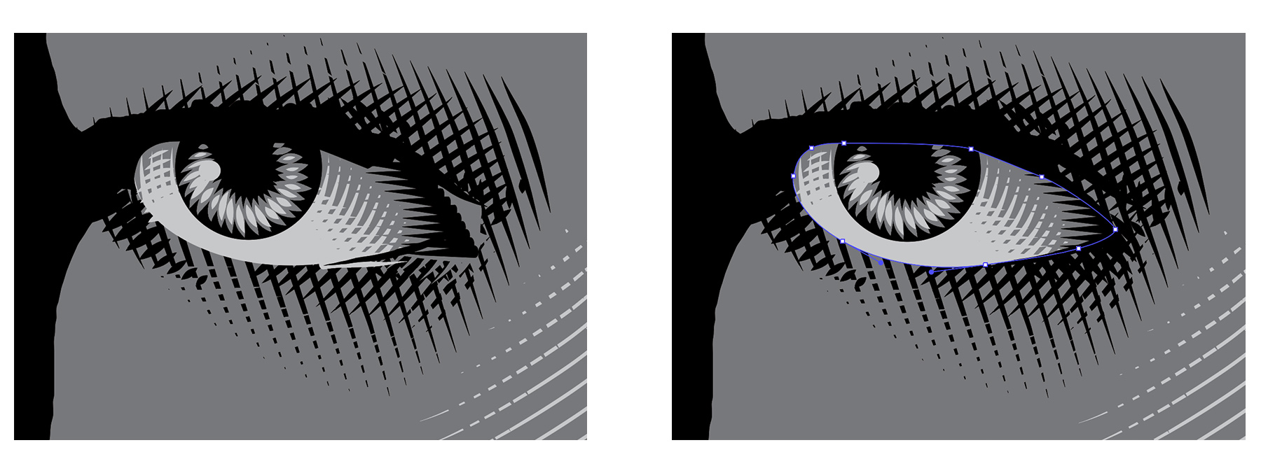 이를 위해 크로스 해칭 효과를 사용하여 눈 흰자에 음영을 만든 다음 크로스 해칭 표시의 눈 모양을 선택하고 오브젝트 > 클리핑 마스크 > 만들기를 선택합니다. (참고: 클리핑 마스크 모양은 클리핑하는 아트웍의 레이어 스택에서 레이어 위에 배치해야 합니다.)