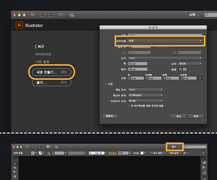 그룹화된 모노그램을 선택하고 Ctrl/Command + C를 눌러 복사합니다. 파일 > 새로 만들기를 선택하고 프로파일: 인쇄를 선택합니다.