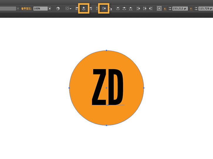 팁: 이니셜 및 모양을 완벽하게 배치하려면 이니셜과 모양을 모두 선택하고 컨트롤 패널에 있는 가로 가운데 정렬 및 세로 가운데 정렬 버튼을 클릭합니다.