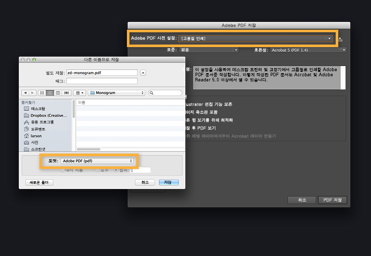 모노그램을 인쇄용으로 저장하려면 파일 > 저장을 선택하고 Adobe PDF를 선택합니다. Adobe PDF 사전 설정 메뉴에서 인쇄 제공업체의 권장 사항에 따라 고품질 인쇄 또는 출판 품질 옵션을 선택합니다.