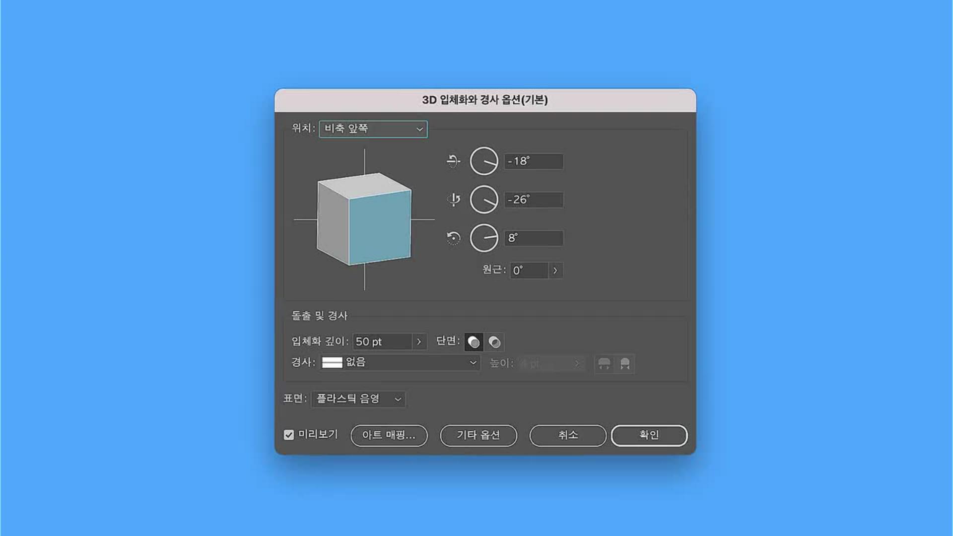 한 번 더 효과> 3D 및 재질> 3D(기본)> 입체화와 경사(기본)를 클릭하여 3D(기본) 대화상자를 활성화합니다.