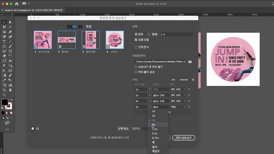 Illustrator에서 원하는 형식에 맞게 디자인한 모든 대지 템플릿을 손쉽게 구현할 수 있습니다(예: Instagram용 정방형, Twitter용 직사각형, 다양한 크기의 웹 배너뿐만 아니라 스티커, 티셔츠, 머그잔 등과 같은 실물 템플릿).