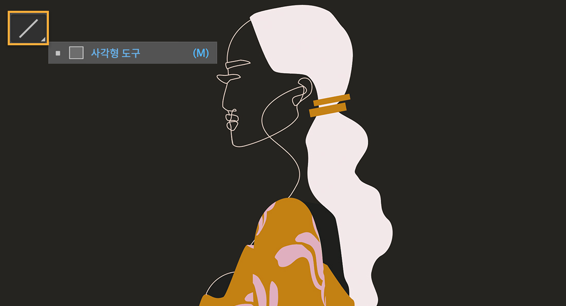 연필 툴과 펜 툴을 사용하여 의류의 나머지 부분과 머리카락을 그린 다음 사각형(M) 툴을 사용하여 머리끈을 그립니다. 선택 툴을 사용하여 원하는 위치로 옮기고 모퉁이 핸들 바깥쪽에 마우스를 가져가 드래그하여 각 사각형을 회전합니다.