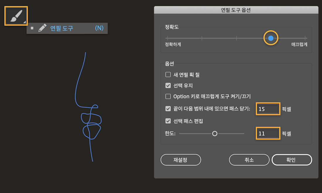 연필을 사용하여 연속적인 패스로 코와 입을 그립니다. 연필 툴이 선택된 상태에서, 속성(윈도우 > 속성) 패널에서 툴 옵션을 클릭하여 연필 설정을 조정하고 확인을 클릭합니다.