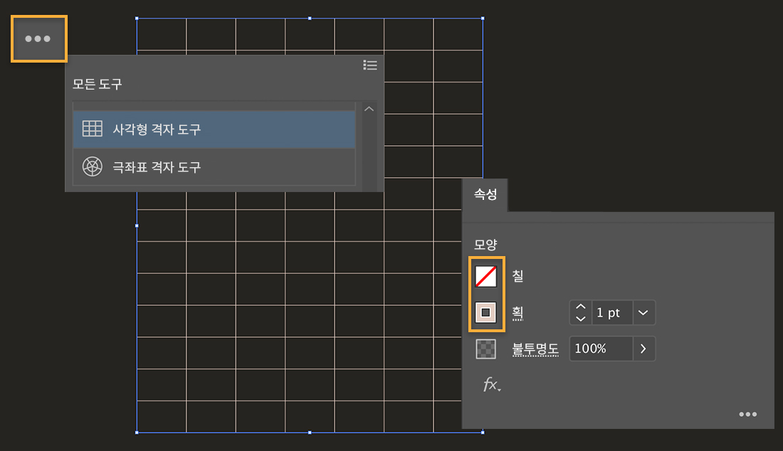 처음 사각형 격자를 사용하는 경우 도구 모음 편집 아이콘(툴바에 있는 줄임표)을 클릭하고 모든 도구 목록에서 메인 툴바로 드래그합니다. 사각형 툴과 같은 다른 툴과 그룹화하려면 해당 툴 위로 드래그하여 그룹에 추가합니다.