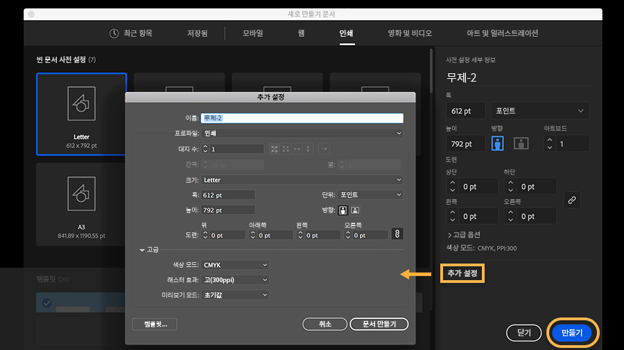 원하는 템플릿이 없는 경우 새로 만들기 문서 창에서 빈 문서 사전 설정으로 시작하고 세부 정보를 자유롭게 변경할 수 있습니다.