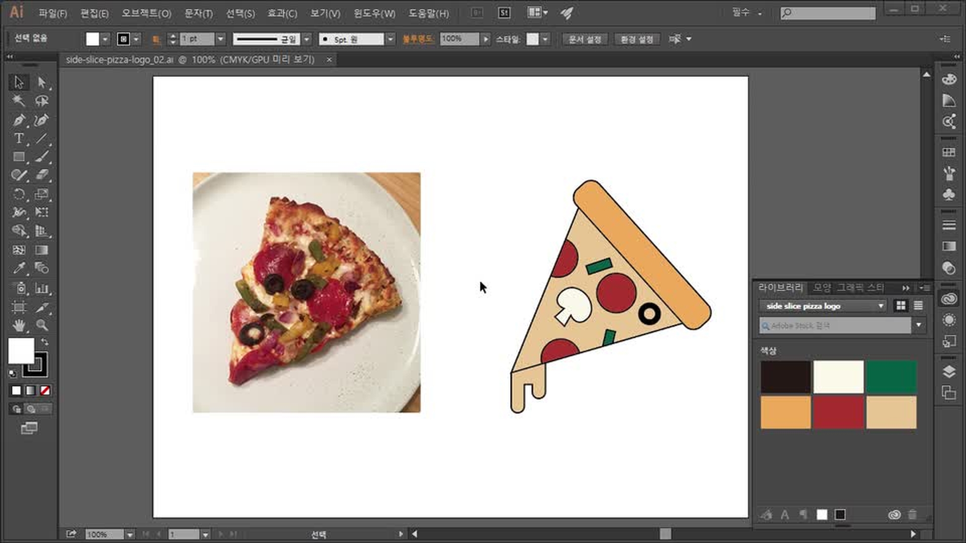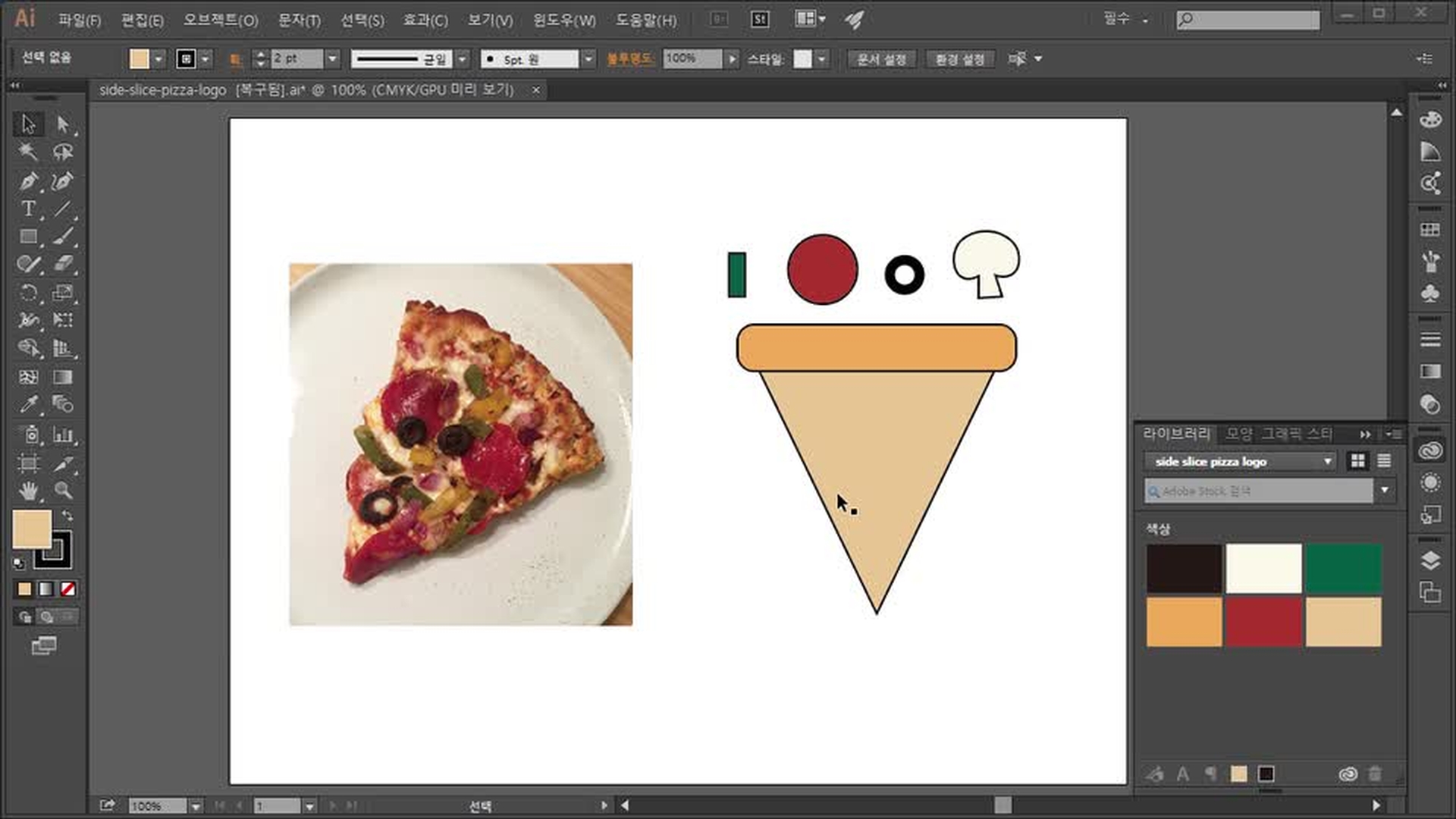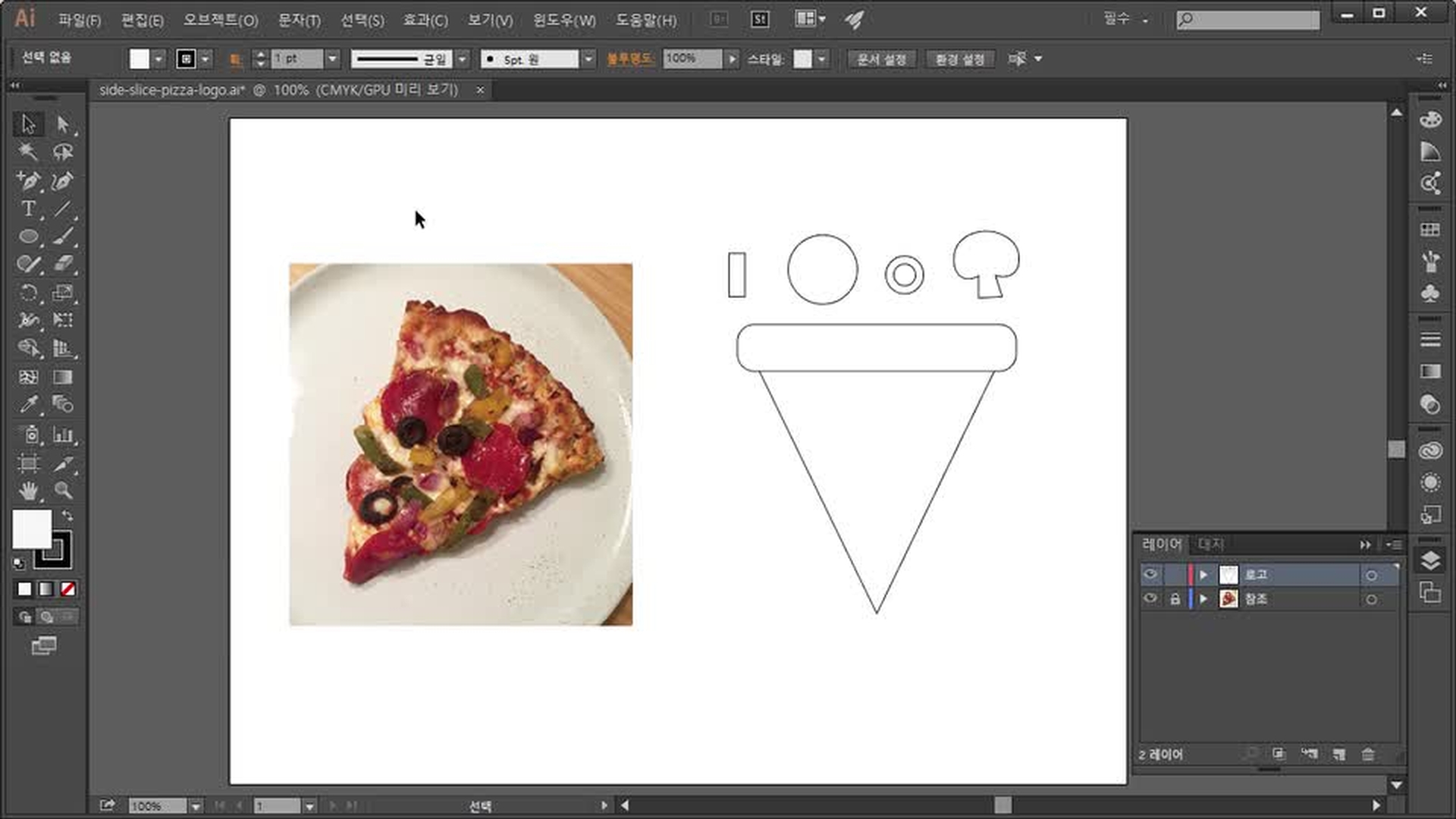 토핑 재료를 개별적으로 그렸다면, 이제 각 모양의 크기를 조정하고 회전하여 피자 조각 위에 토핑들을 얹어봅니다.