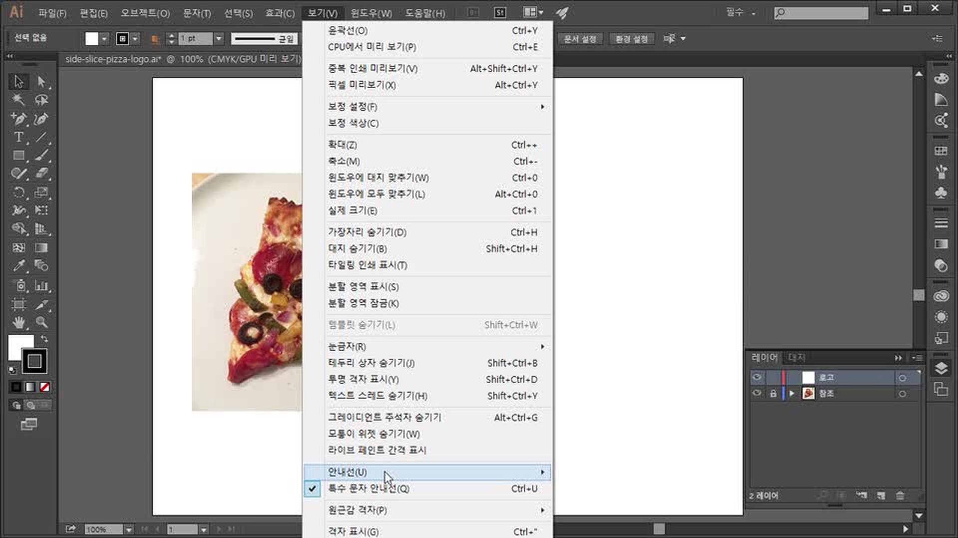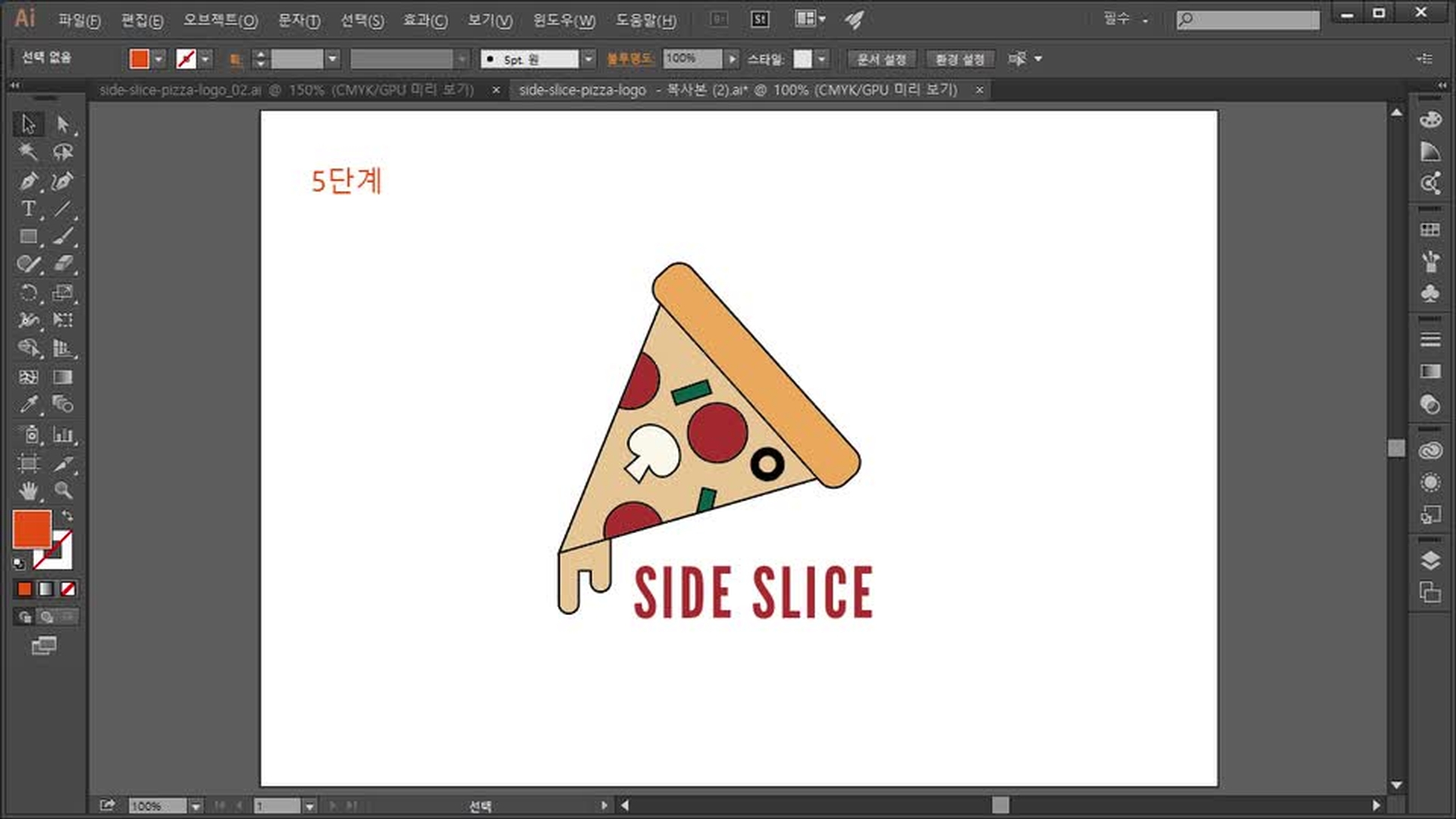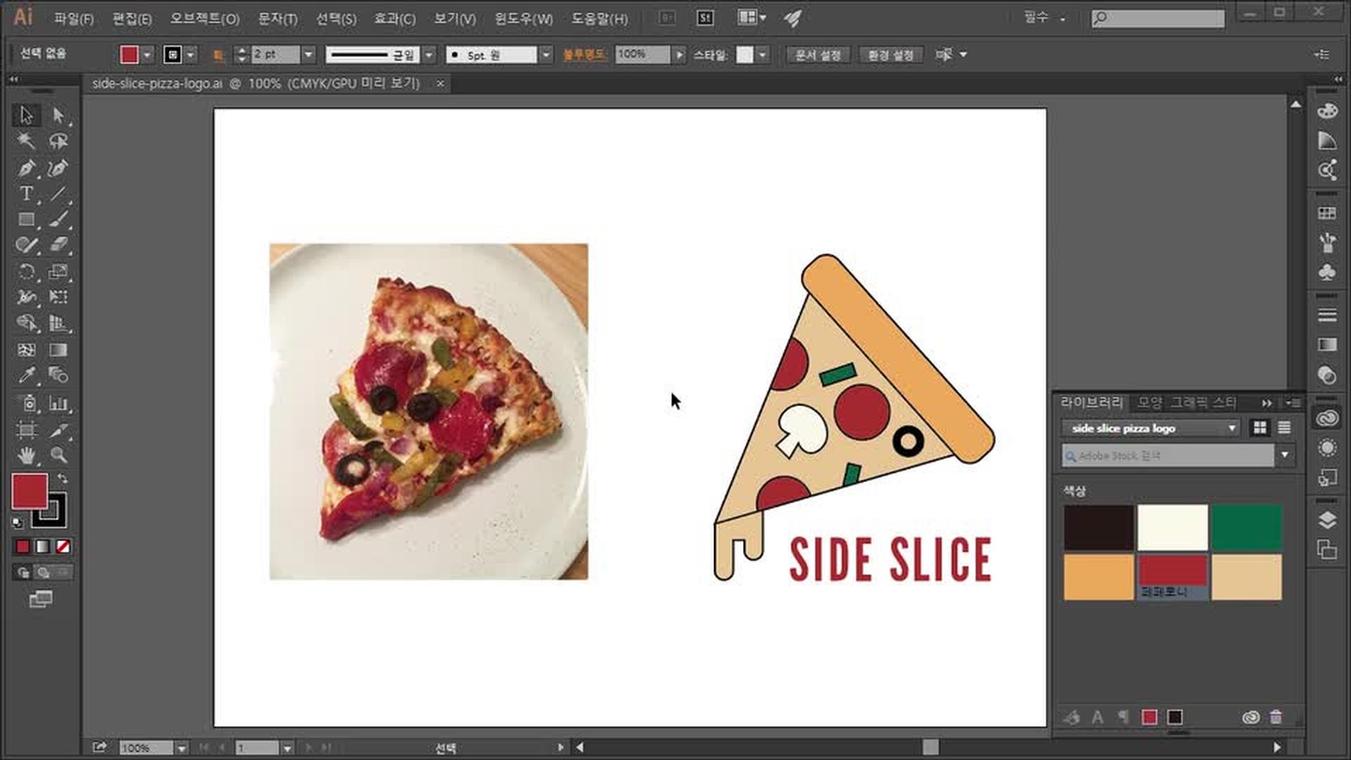 토핑 재료를 개별적으로 그렸다면, 이제 각 모양의 크기를 조정하고 회전하여 피자 조각 위에 토핑들을 얹어봅니다.