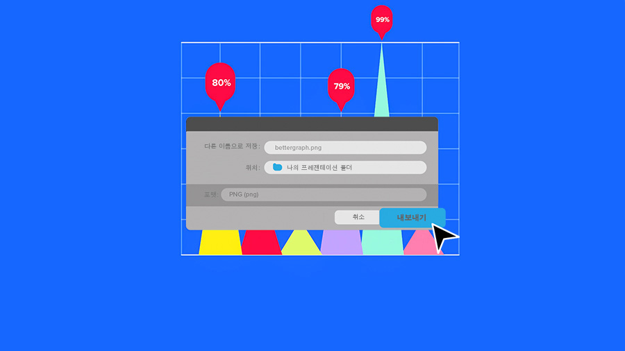 파일 > 내보내기 > 내보내기 형식에서 PNG를 선택하여 투명한 배경으로 된 그래프를 저장합니다. 그런 다음 프레젠테이션에 배치합니다.