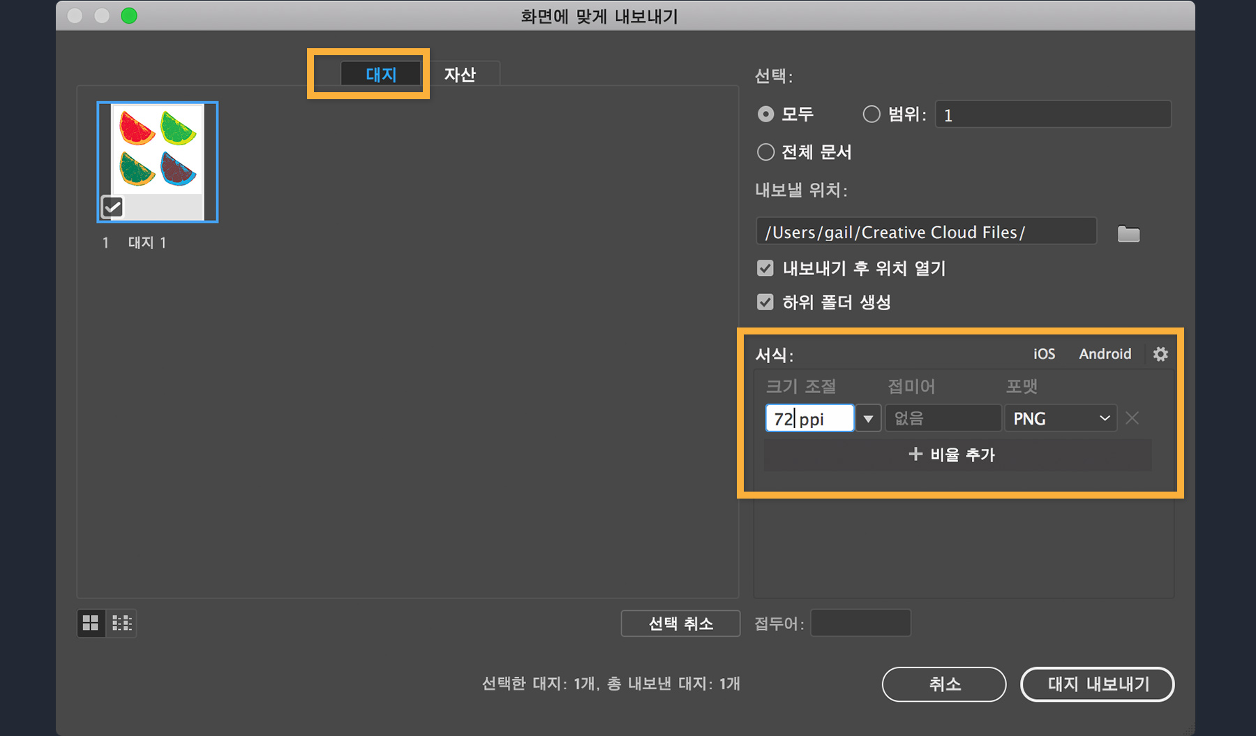 일러스트레이션을 저장하여 화면에서 보려면 파일 > 내보내기 > 화면에 맞게 내보내기를 선택합니다. 화면에 맞게 내보내기 대화 상자에서 대지를 선택하고 파일을 저장할 위치를 선택한 다음 PNG, JPEG 등의 적합한 포맷을 선택합니다. 그런 다음 대지 내보내기를 클릭합니다.