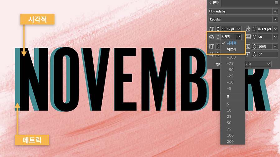 문자 툴로 제목 텍스트를 선택하고 자간 메뉴에서 값을 선택하거나 입력합니다.