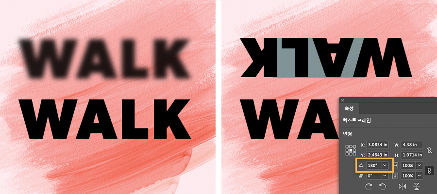 제목 텍스트를 180°로 회전하여 추상적인 모양으로 만들 수 있습니다. 완료되면 선택 툴로 텍스트를 선택하고 속성 패널의 변형 섹션에서 0°로 다시 설정합니다.