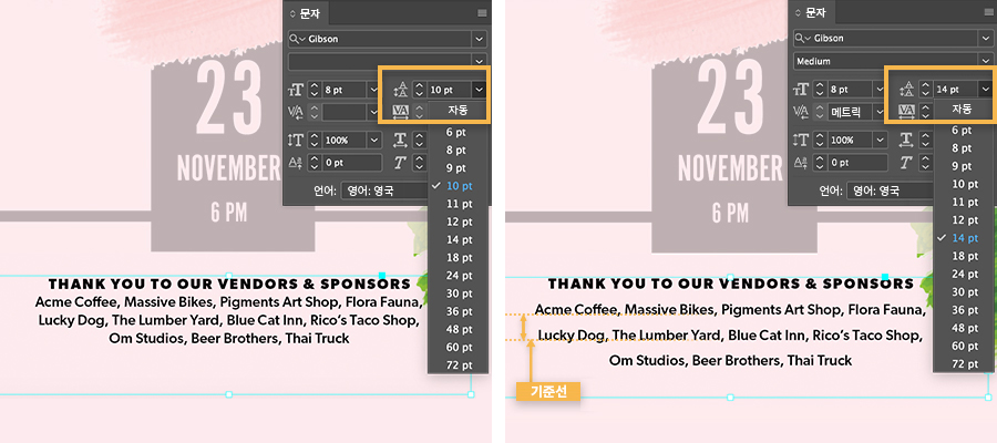 문자 패널 또는 속성 패널에서 행간을 설정합니다.