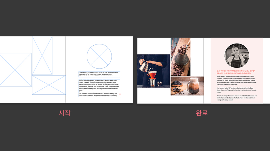 실습 파일로 제공된 resize-content-frame_START.indd는 빈 프레임이 배치된 두 페이지 분량의 펼침면 문서입니다. 이 파일을 열고 자신이 보유한 이미지나 제공되는 샘플 파일로 프레임을 채워보세요.