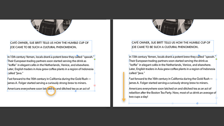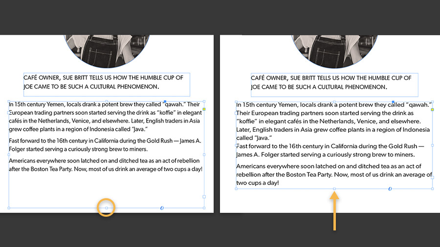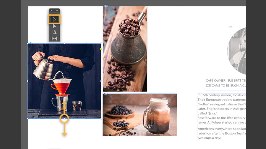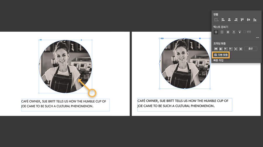 Café-Owner.jpg를 오른쪽 페이지의 원형 프레임으로 드래그하고, 앞서 연습한 대로 프레임 안에서 아트웍의 크기와 위치를 원하는 대로 조정합니다.
