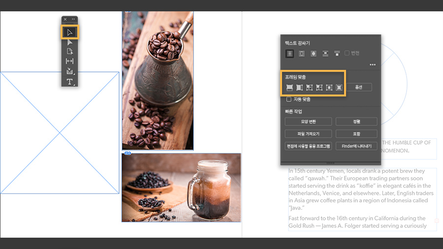 아트웍이나 텍스트를 프레임에 배치한 후에도 프레임이나 프레임 안의 콘텐츠 또는 이 두 가지를 이동하거나 크기를 조정할 수 있습니다.