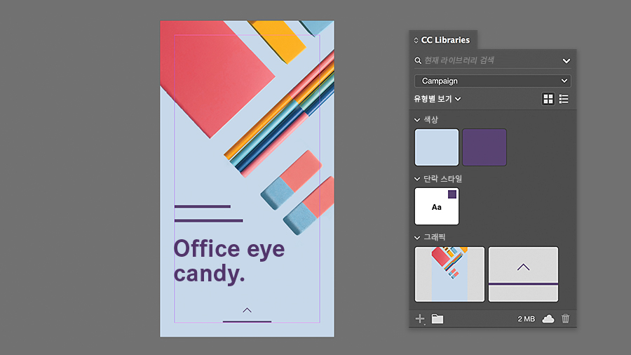 CC Libraries 패널: 색상, 텍스트 서식 및 그래픽과 같은 비주얼 아이덴티티 요소를 Creative Cloud Libraries에 저장할 수 있습니다. 모든 Adobe 데스크탑 및 모바일 앱에서 요소의 구성과 액세스가 가능합니다. 팀원과 라이브러리를 공유하면 모든 최신 에셋을 이용할 수도 있습니다.