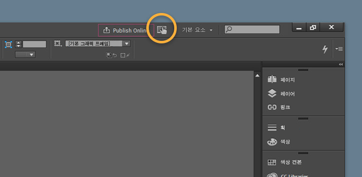 터치 작업 영역을 이용하려면 창 > 작업 영역 > 터치를 선택하거나 컨트롤 패널의 오른쪽 상단 모서리에 있는 터치 아이콘을 누릅니다.