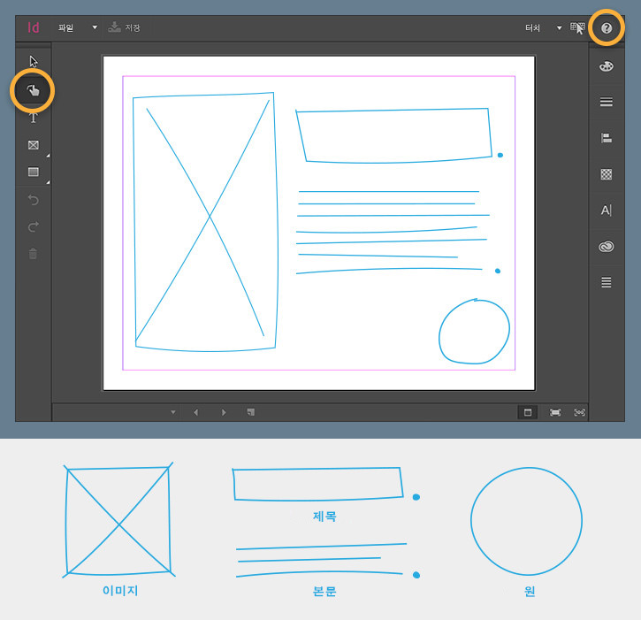 Surface Pro(버전 3 이상)와 같이 Windows 태블릿(Windows 8 이상)용으로 설계된 터치 작업 영역에서 모양을 그리거나 텍스트와 이미지 자리 표시자를 추가할 수 있는 직관적인 터치 제스처를 사용하여 레이아웃을 만들 수 있습니다. 레이아웃을 구성하면 이미지, 색상 및 텍스트 스타일을 포함한 Creative Cloud Libraries의 다양한 크리에이티브 에셋을 추가할 수 있습니다.