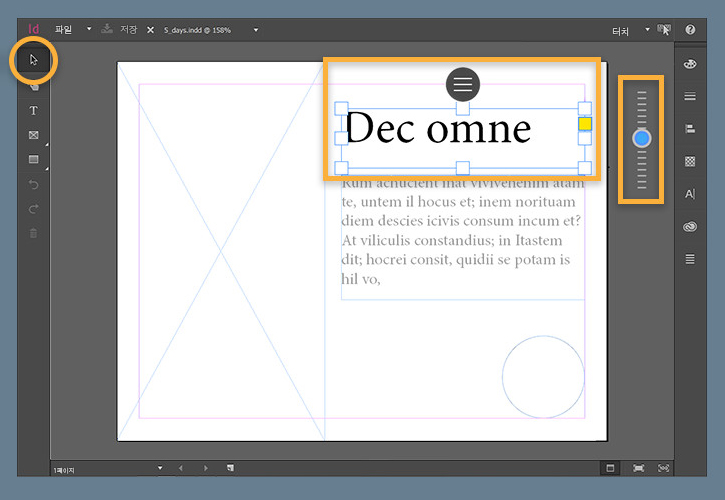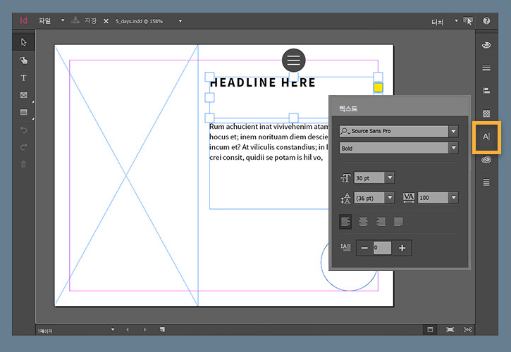 자리 표시자 텍스트를 편집하려면 문자 툴을 선택하거나 두 번 눌러 문자 툴이 자동으로 표시되면 텍스트 프레임 안을 누릅니다.
