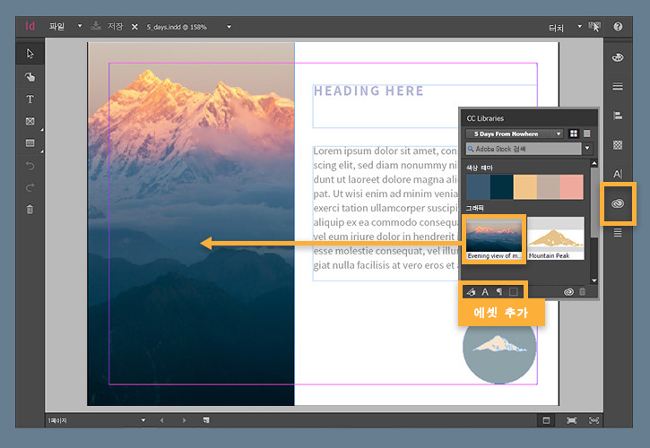 CC Libraries를 눌러 수집한 에셋에 액세스하거나 문서에서 새로운 에셋을 추가합니다.