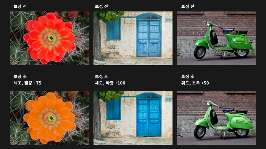 해당 색상의 슬라이더를 드래그하여 사진 전체에서 해당 색상의 색조, 채도 및/또는 휘도를 조정합니다. 색조는 색상을 달리 부르는 말이고, 채도는 색상의 강도, 휘도는 색상의 밝기입니다.