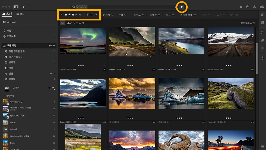 Lightroom에서는 날짜별 필터링, 앨범 만들기, 플래그와 별 등급 적용, 강력한 자동 검색 기능 등을 사용하여 특정 유형의 사진을 찾을 수 있습니다.