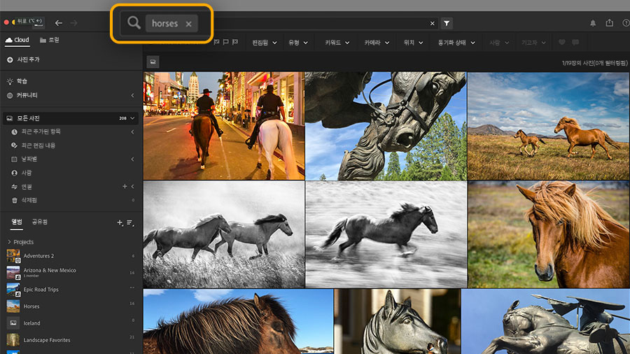 Lightroom은 콘텐츠를 기반으로 사진을 자동으로 찾습니다. 키워드를 수동으로 추가하지 않고도 "말" 또는 "산"과 같은 주제어를 사용하여 사진을 검색할 수 있습니다. 검색 막대에 검색할 용어를 입력해보세요. 워크플로우에 적합한 키워드를 자유롭게 추가하고 검색하는 것도 가능합니다. 또한 촬영 위치와 다양한 카메라 메타데이터별로도 검색할 수 있습니다.