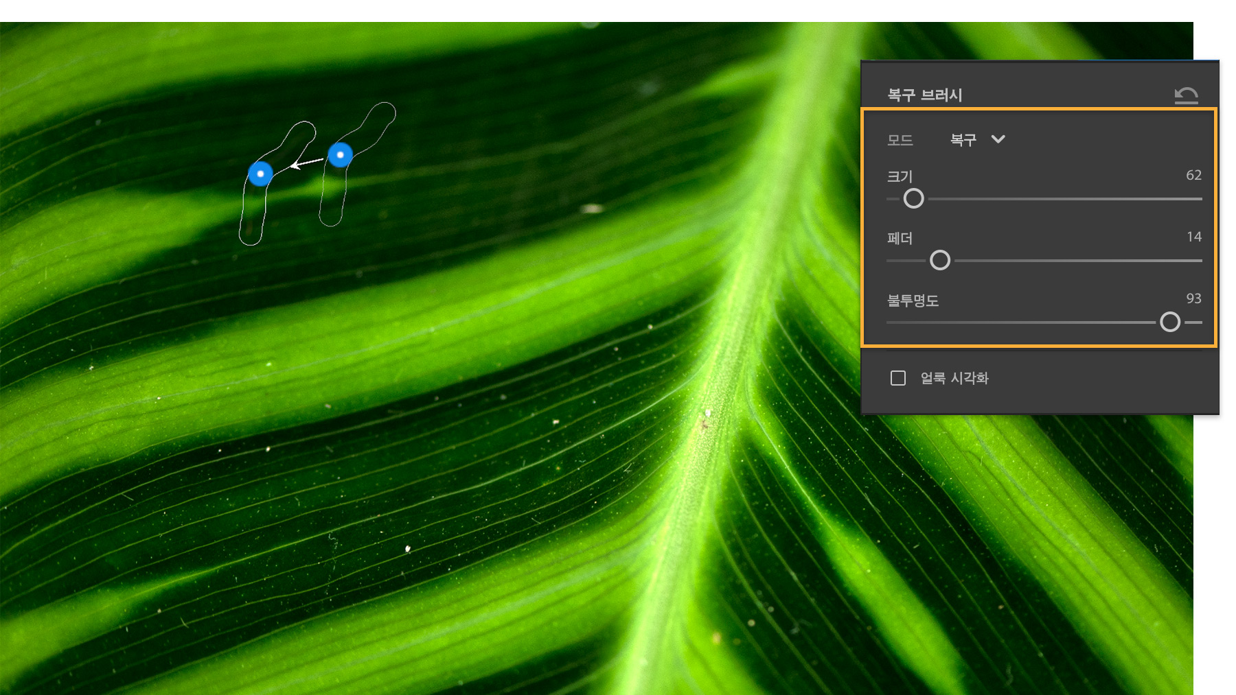 브러시 크기를 보정할 영역에 맞게 조정합니다. 키보드에서 대괄호 키([ ])를 사용하여 브러시 크기를 조정합니다. 머리카락 또는 스크래치와 같이 큰 얼룩 위로 드래그합니다. 먼지 얼룩과 같은 작은 영역도 클릭하여 복구합니다.