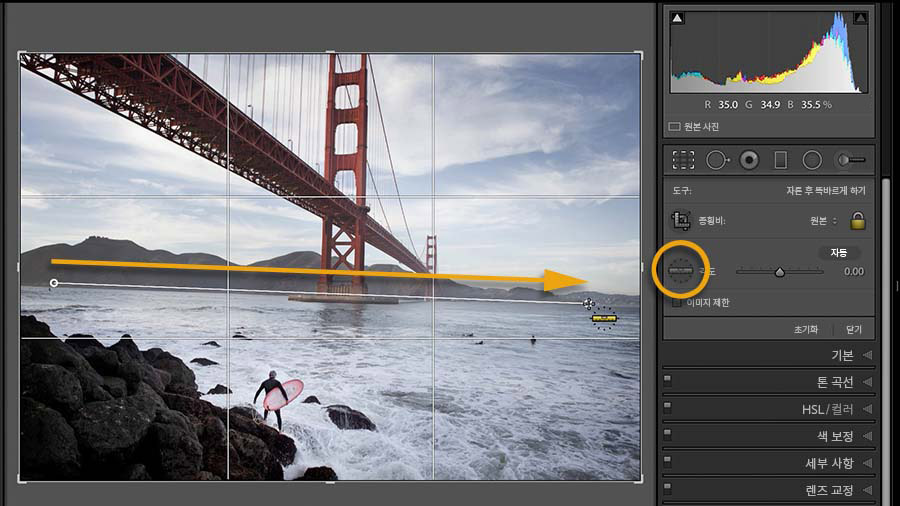 예제 사진은 약간 기울어져 수평이 아닙니다. 명확한 수평선으로 사진을 똑바르게 하려면 자른 후 똑바르게 하기 패널에서 각도 툴을 선택하고 사진에서 기울어진 수평선 부분을 따라 드래그합니다. 이렇게 하면 Lightroom Classic에서 이 선이 수평이어야 함을 알 수 있습니다. 마우스를 놓으면 사진이 자동으로 회전하여 수평을 만듭니다.