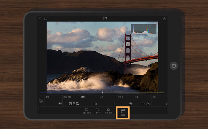 모바일 디바이스에서 이미지를 선택한 다음 조정 아이콘을 눌러 편집 컨트롤을 사용합니다. 예를 들어 노출 컨트롤을 누르고 슬라이더를 좌우로 밀면 이미지의 밝기를 조정할 수 있습니다. 흰색 균형과 같은 일부 컨트롤에서는 옵션 목록이 표시됩니다.